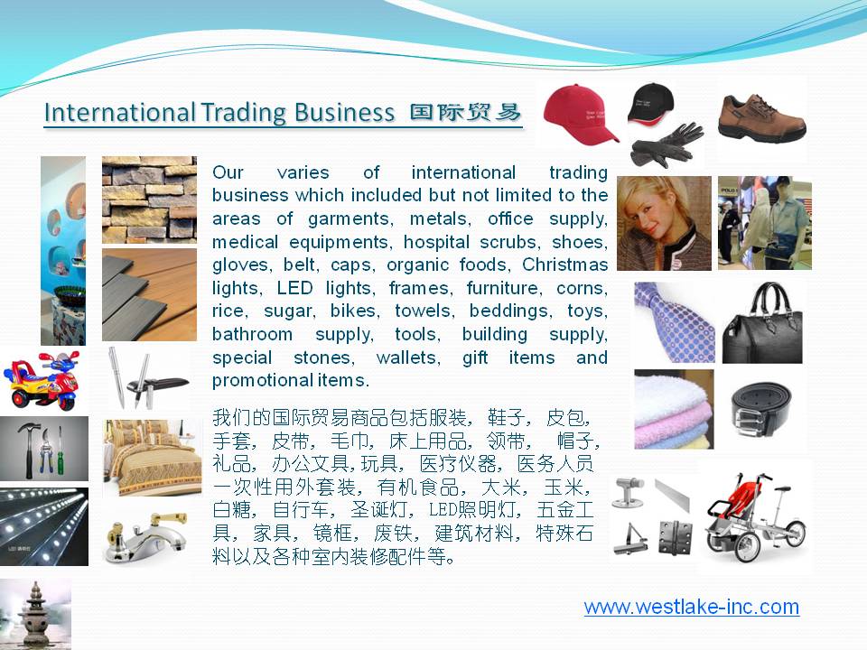Our varies of international trading business which included but not limited to the areas of garments, metals, office supply, medical equipments, hospital scrubs, shoes, gloves, belt, caps, organic foods, Christmas lights, LED lights, frames, furniture, corns, rice, sugar, bikes, towels, beddings, bathroom supply, tools, building supply, special stones, wallets, gift items and promotional items.