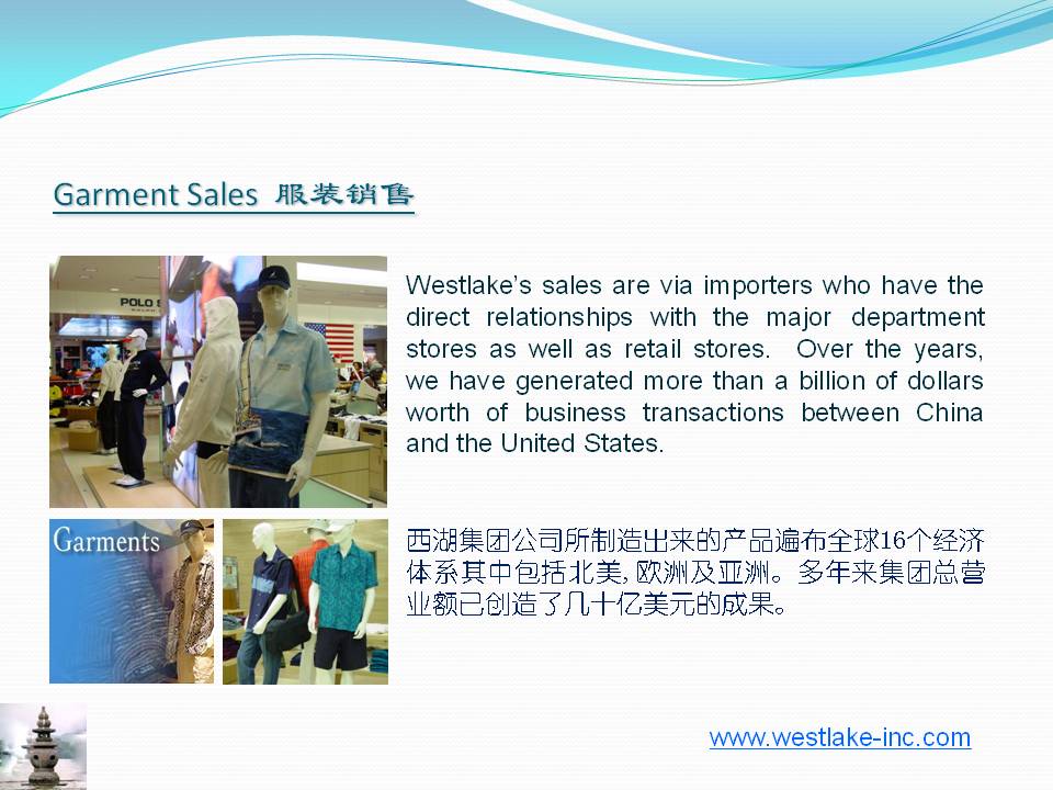 We produced over 1,000,000 quality garments every month in our China factories and shipped to the United States, Japan, Italy, France, Germany, Chile, Australia, Greece, Panama, Holland and Canada. Our merchandise were in most of the department stores such as Saks Fifth Avenue, Bloomingdale’s, Neiman Marcus, Nordstrom, Macy’s, etc.